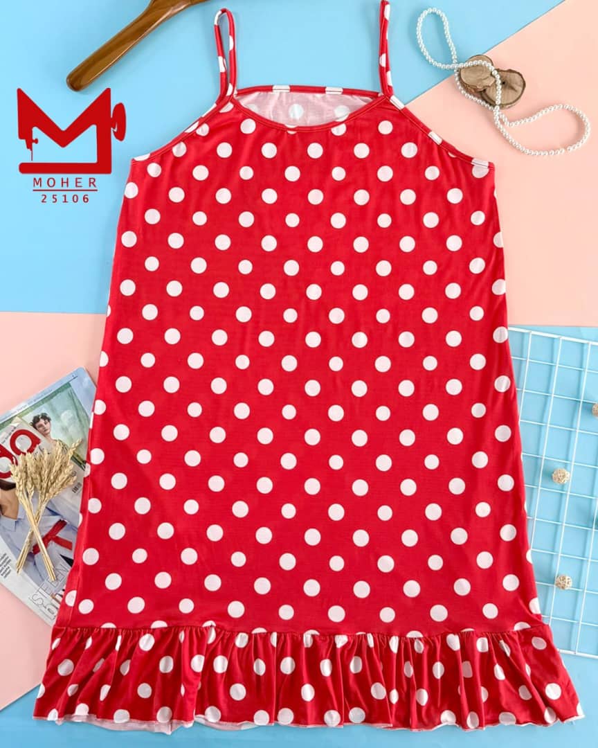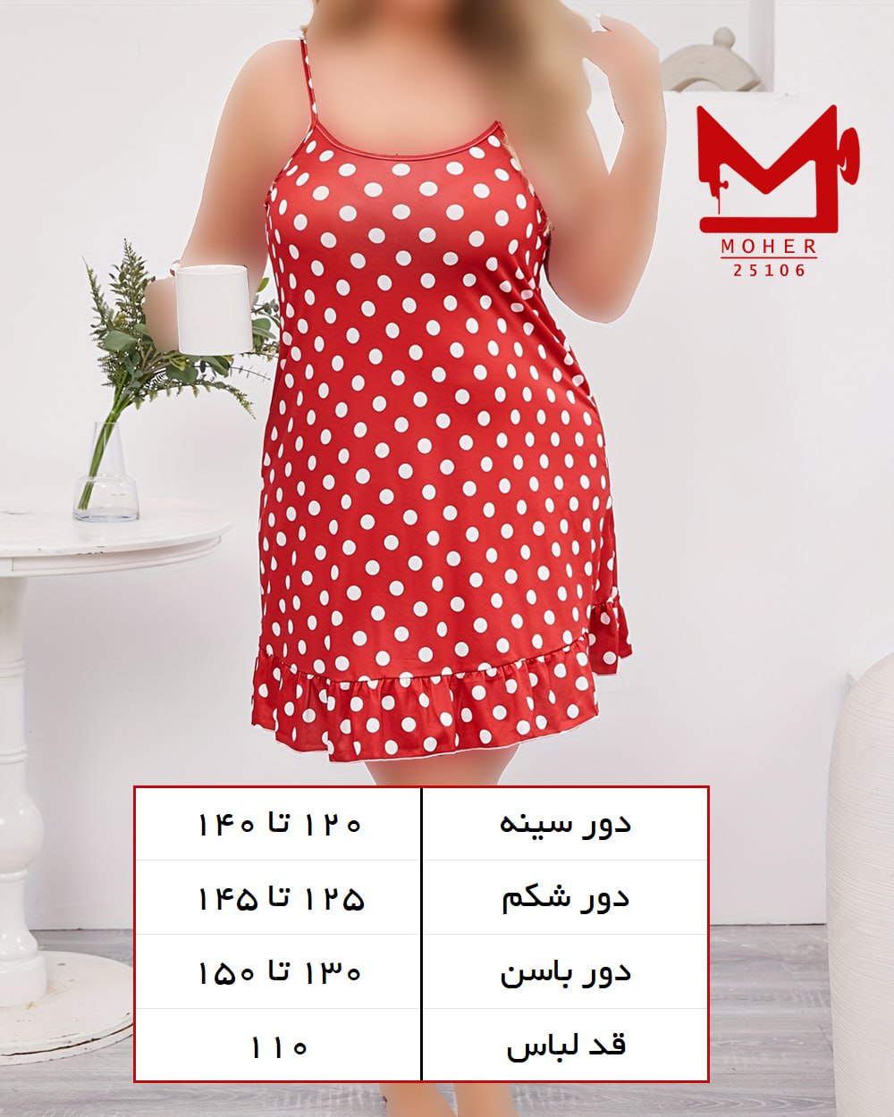 سایز : فری سایز مناسب 48 تا 56 جنس : لاکرا سافت لباس خواب رکابی با زمینه قرمز و خال خال های سفید که جنس نرم و کشسانی خوبی داره.