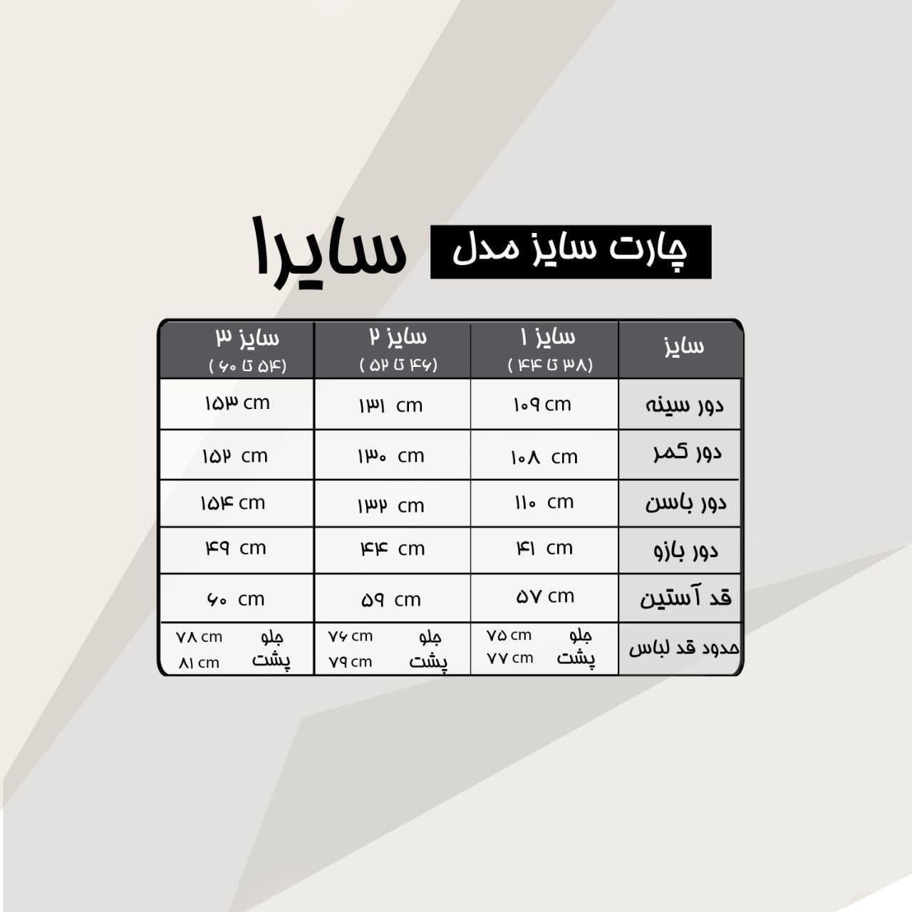 سایز ها : سایز دو 46 تا 52, سایز سه 54 تا 60, سایز یک 38 تا 44