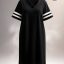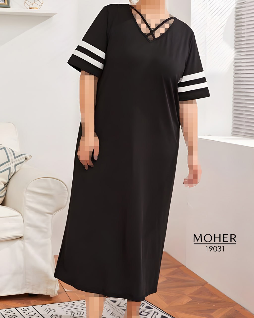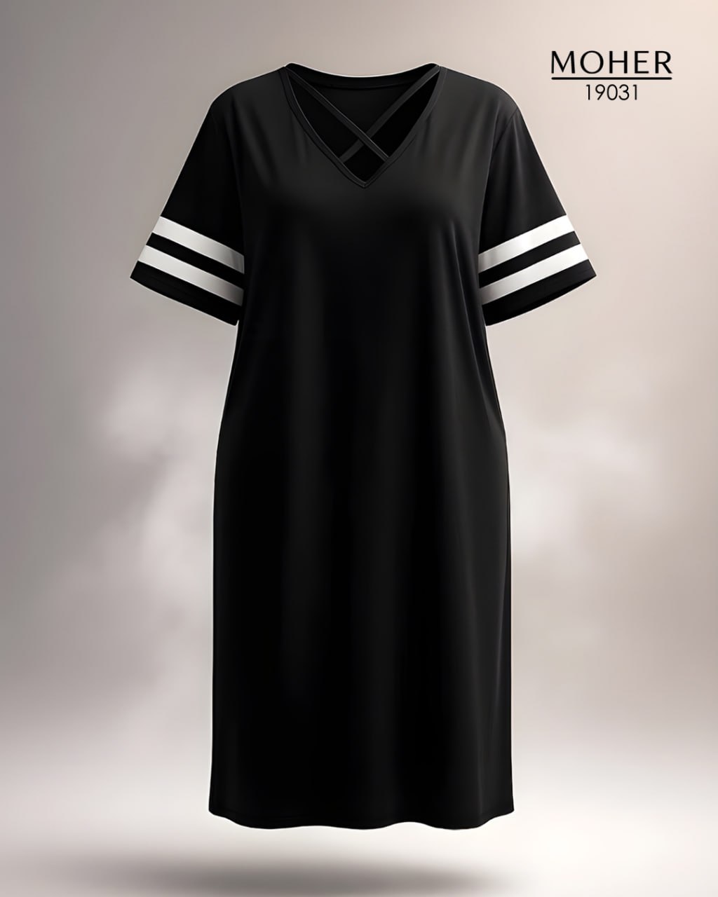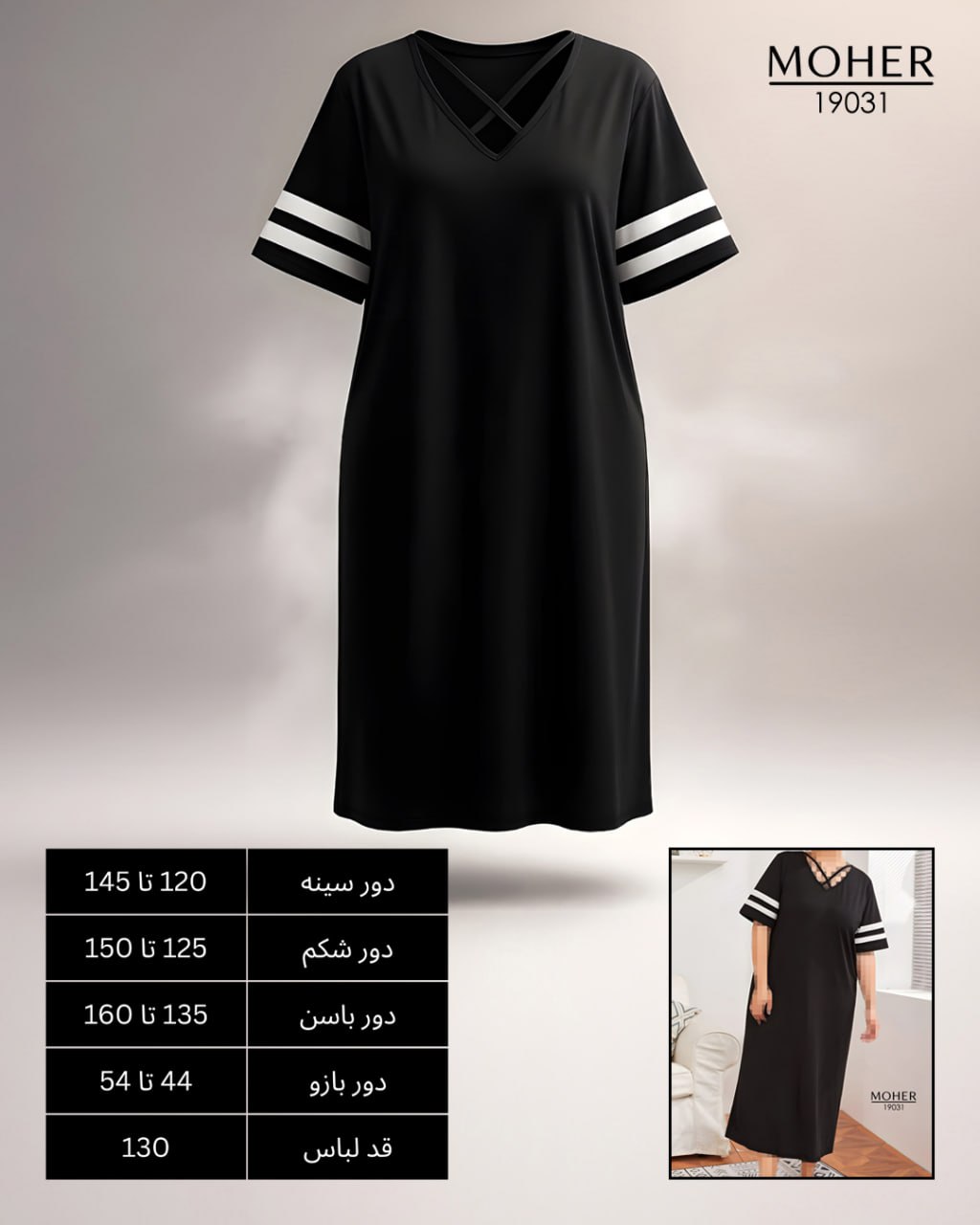 یقه ضربدری + نوارهای سفید روی آستین، این پیراهن راحتی مشکی رو به یه انتخاب خاص برای خونه تبدیل کرده. هم راحت، هم خوشفرم روی تن سایز بزرگها.