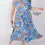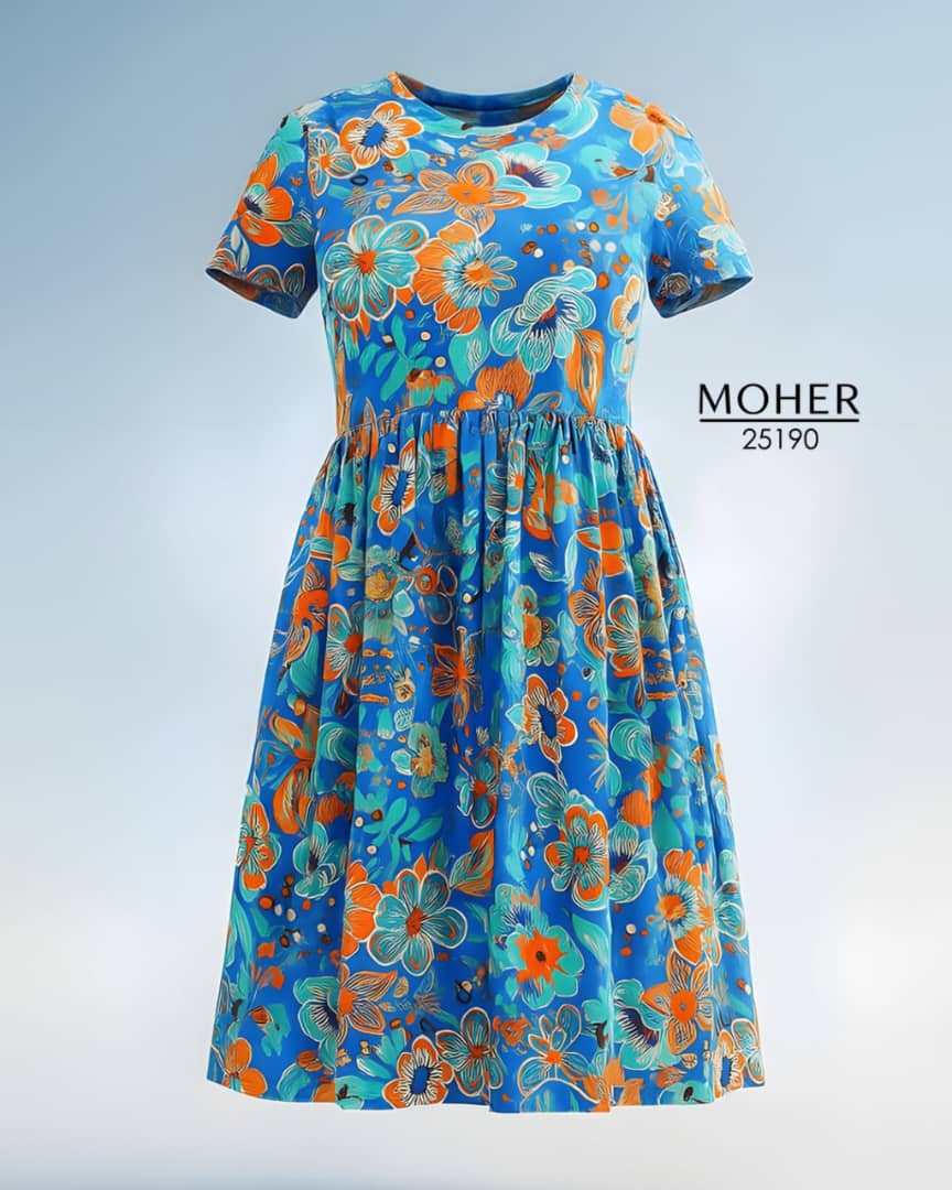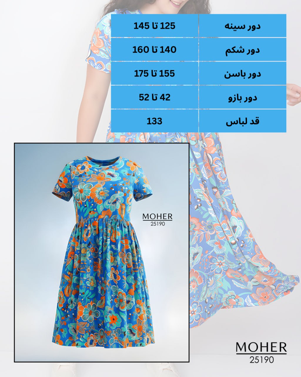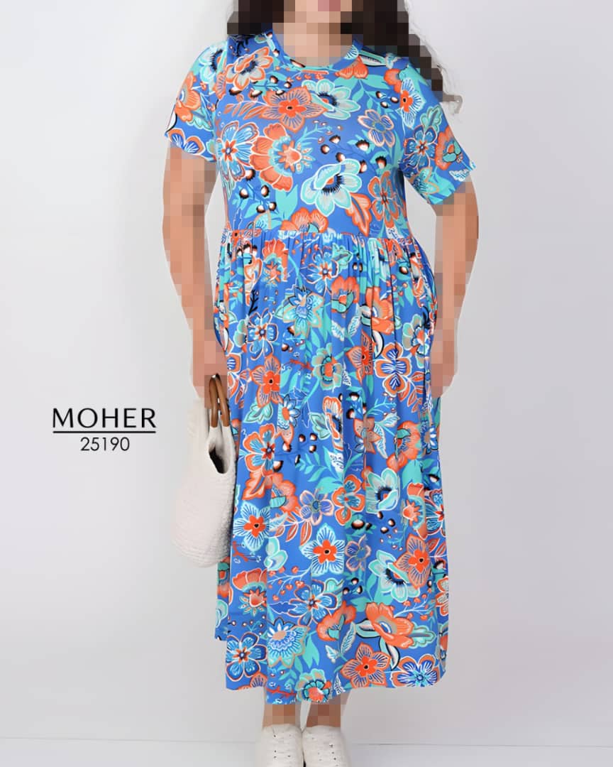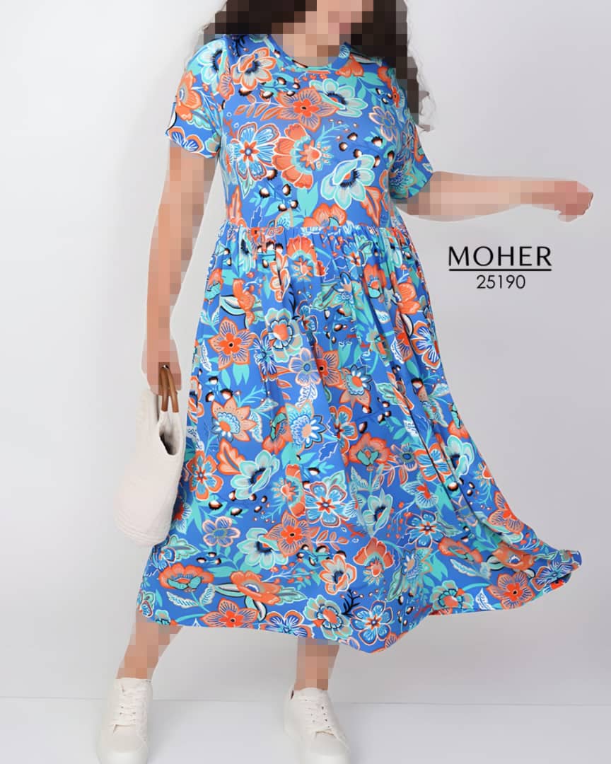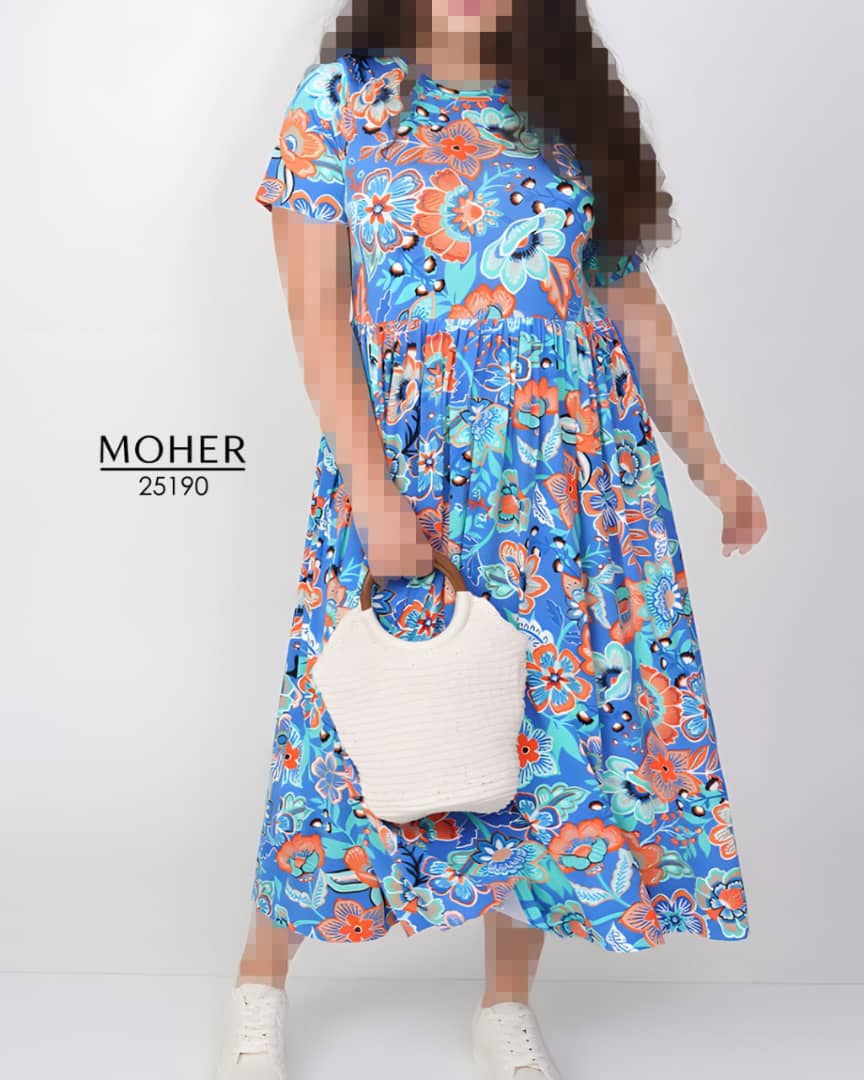 زمینه آبی آسمونی با گلهای بزرگ نارنجی، سفید و فیروزهای، این لباس رو به یه انتخاب خاص برای خانمهایی تبدیل کرده که عاشق استایلهای رنگی، راحت و چشمگیرن.