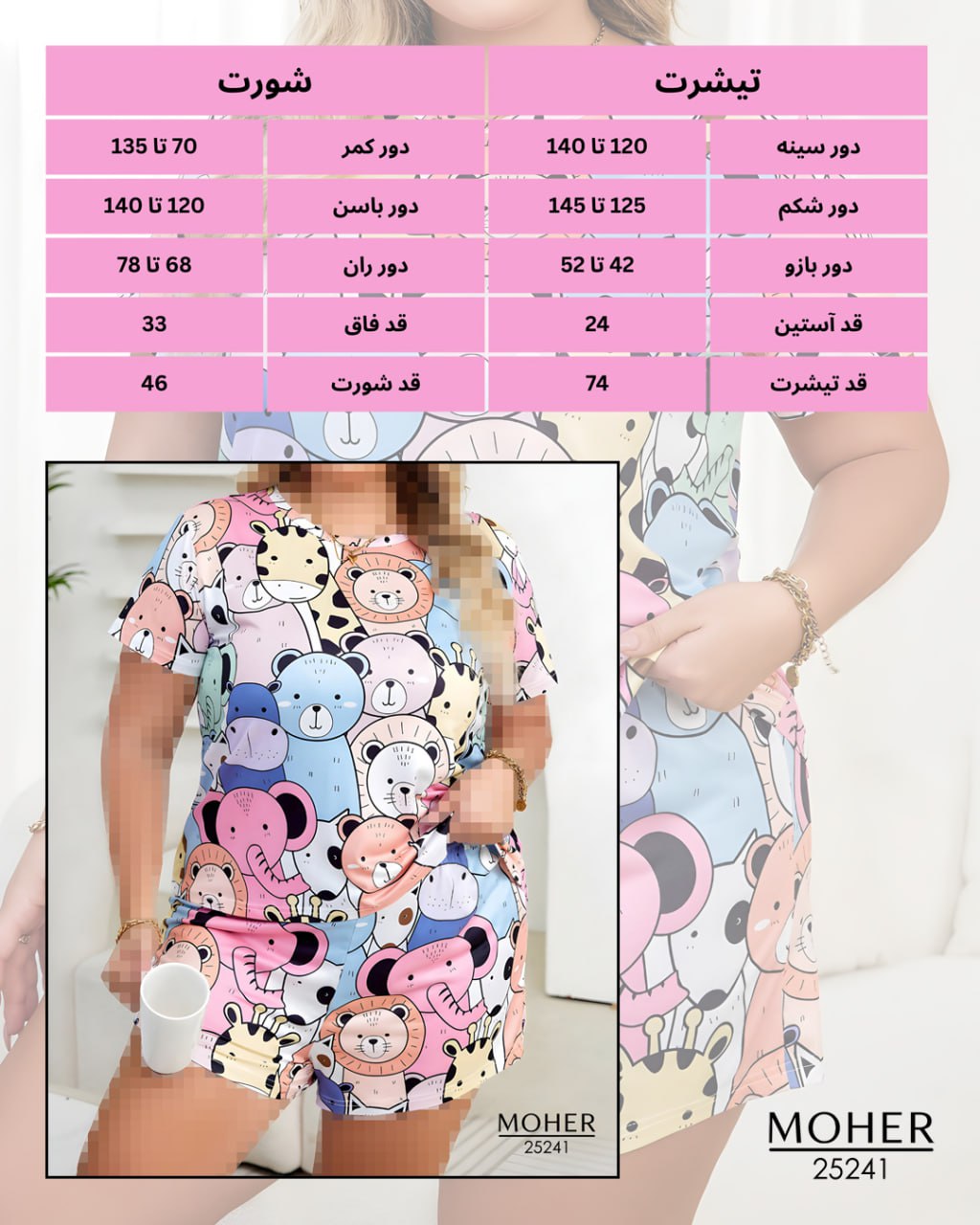 ست راحتی زنانه سایز بزرگ طرح حیوانات فانتزی یه انتخاب بامزه و خاص برای خانمهایی که میخوان تو خونه هم شیک و بانمک باشن! این ست شامل تیشرت و شورت با طرحهای جذاب شیر، فیل، خرس و زرافهست که استایل خونهتون رو پر از انرژی مثبت میکنه.