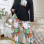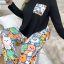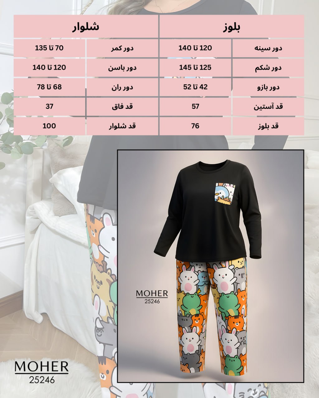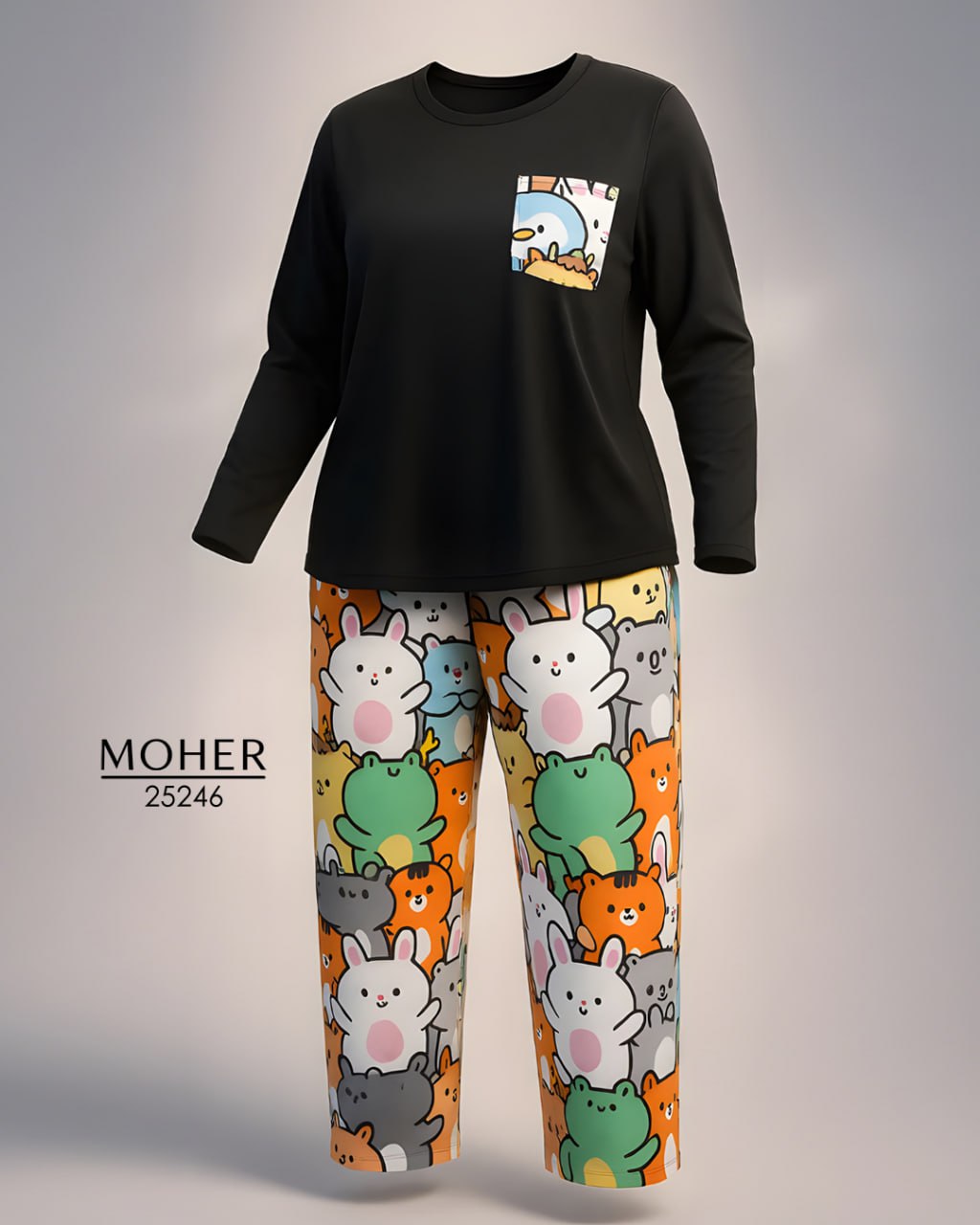 این ست شامل یه بلوز مشکی ساده با جیب رنگی بامزه و یه شلوار فانتزی پر از شخصیتهای بانمک (خرگوش، گربه، قورباغه، خرس و کلی کاراکتر دوستداشتنی دیگه) هست که انرژی و حال خوب رو به خونه میاره.