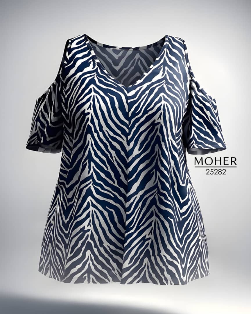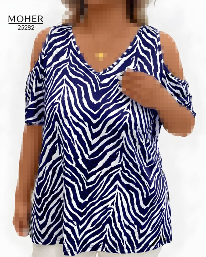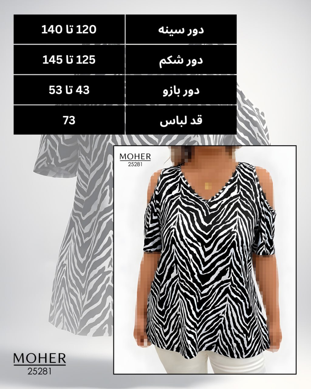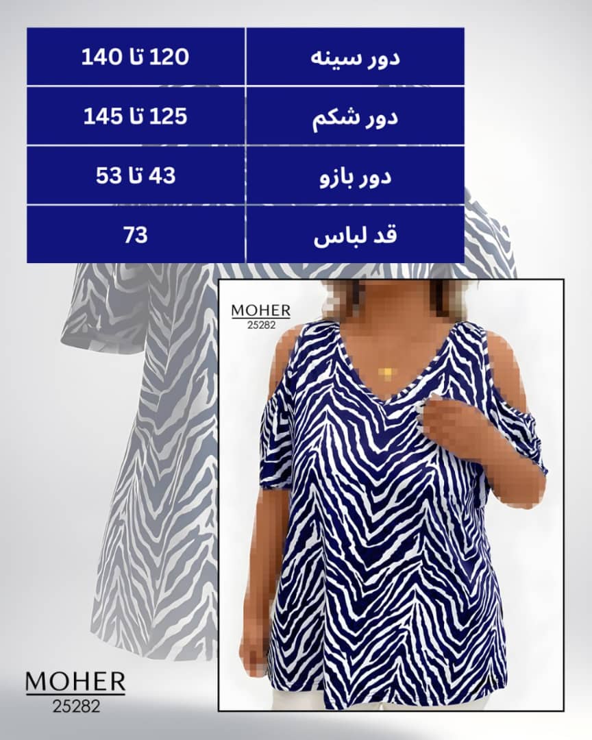 تیشرت سرشانهباز زنانه سایز بزرگ طرح زبرا آبی سفید، انتخابیه شیک و هوشمندانه برای خانمهایی که هم راحتی میخوان و هم استایل خاص!