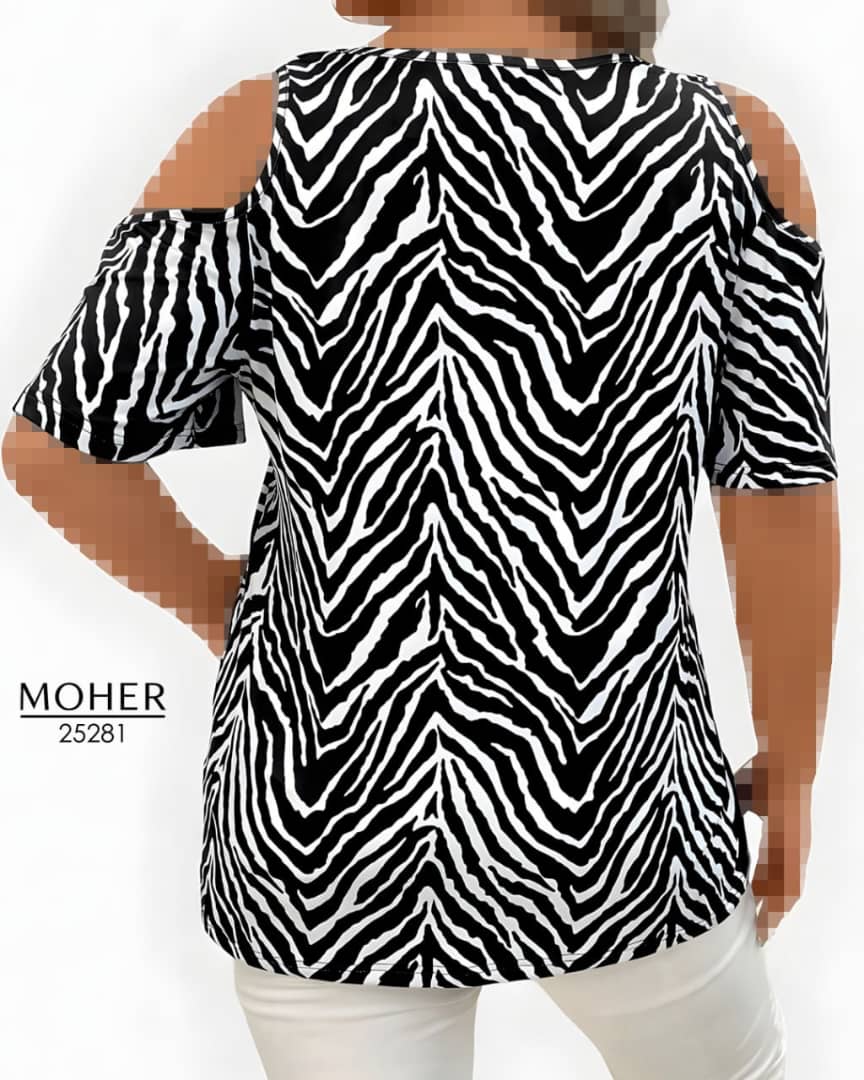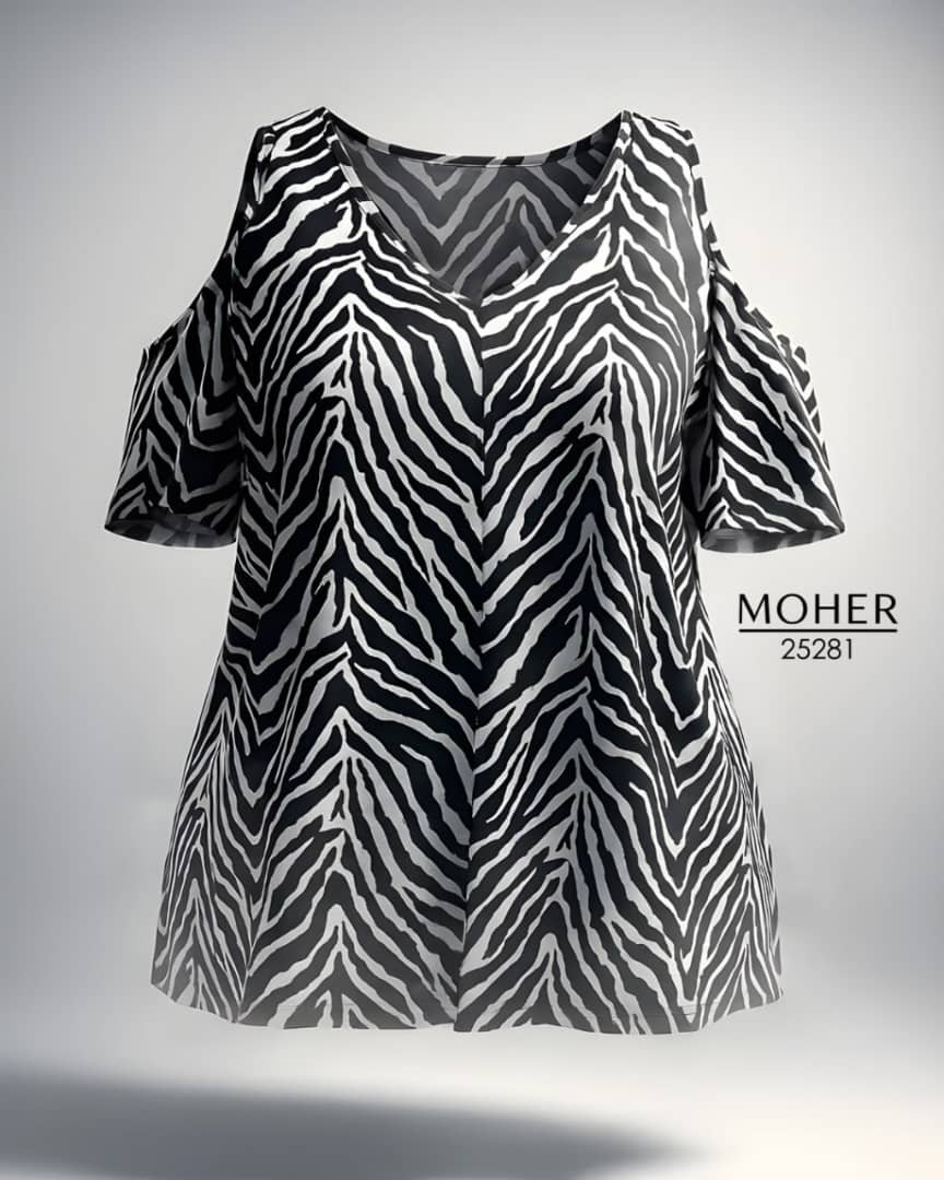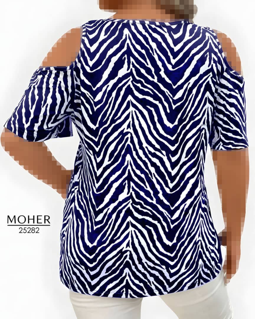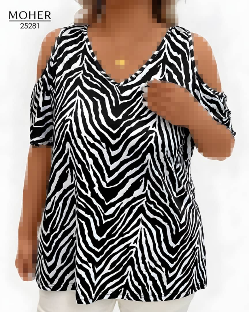 تیشرت سرشانهباز زنانه سایز بزرگ طرح زبرا آبی سفید، انتخابیه شیک و هوشمندانه برای خانمهایی که هم راحتی میخوان و هم استایل خاص!