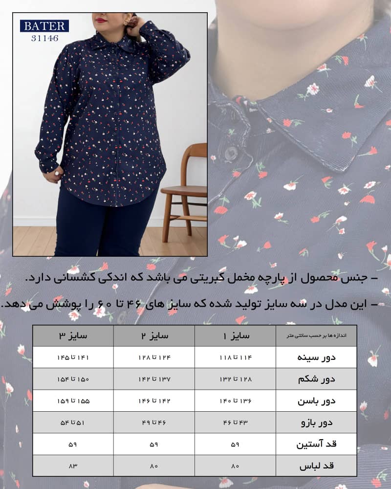 ♦️سایزبندی : این شومیز در سه سایز تولید شده که مناسب ۴۶ تا ۶۰ می باشد
