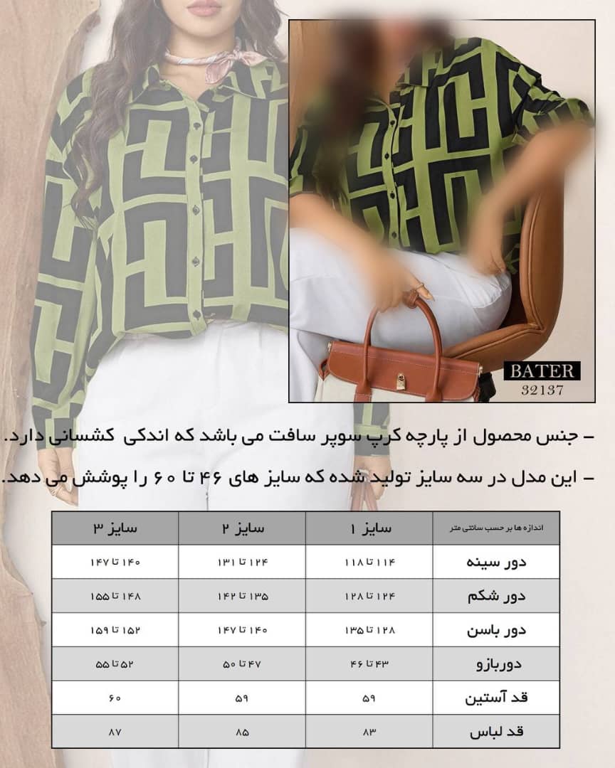 ♦️سایزبندی : این شومیز در سه سایز تولید شده که مناسب ۴۶ تا ۶۲ می باشد